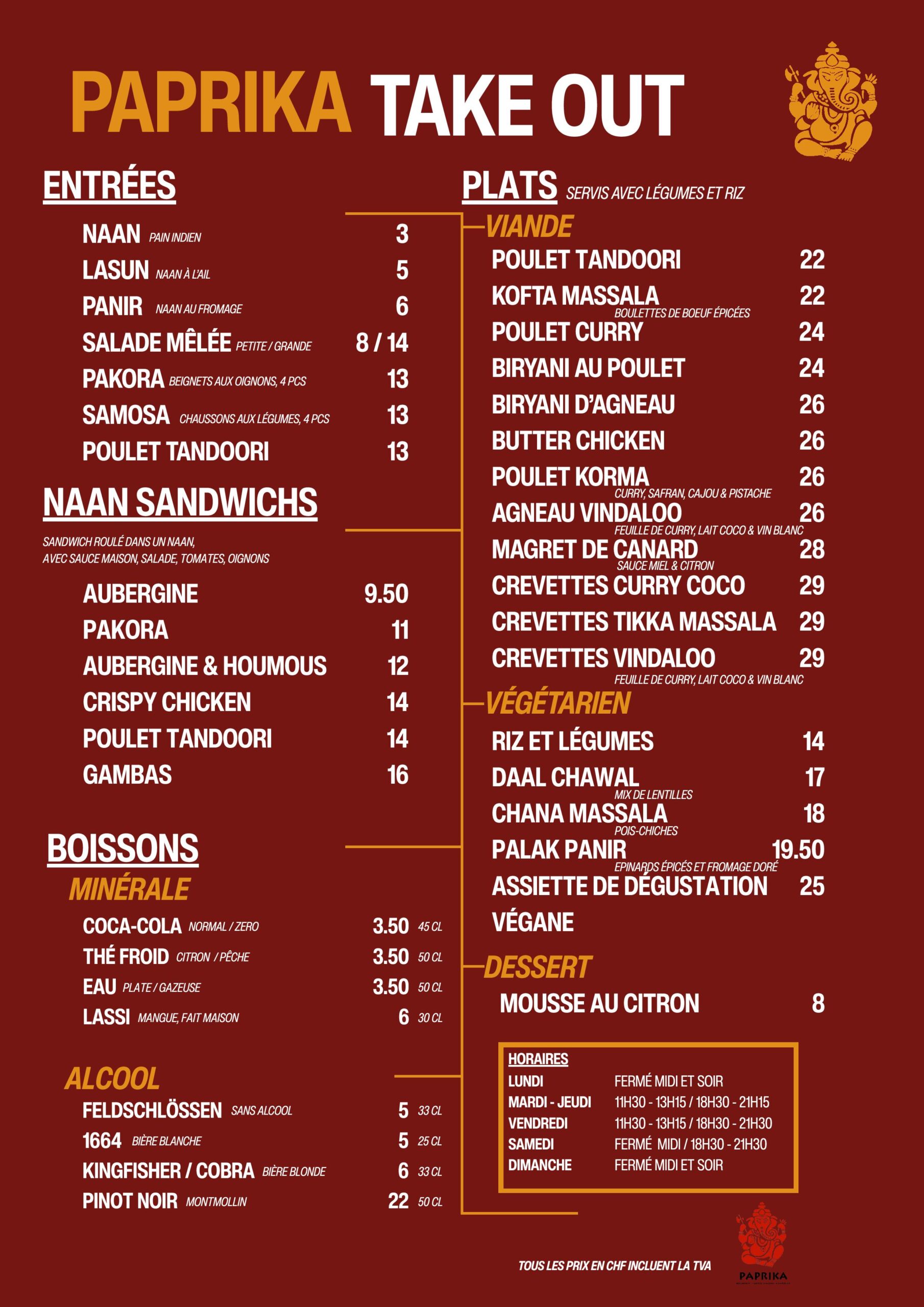 Le Restaurant Paprika réunit la richesse de la cuisine indienne avec une expérience culinaire à la fois moderne et conviviale. Des plats tandoori fumants aux currys réconfortants en passant par des desserts faits maison, chaque assiette est une véritable célébration d’épices audacieuses et de saveurs authentiques.