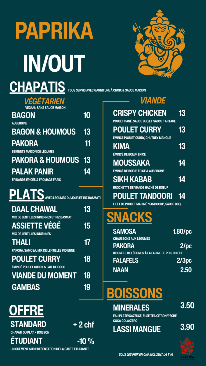 Retrouvez les saveurs du Paprika au centre-ville de Neuchâtel. En semaine, nous proposons chaque midi des repas de qualité à petit prix, préparés sur place.